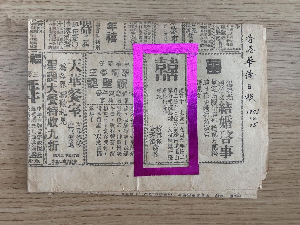 1945年12月25日,钱林保和高芳仪在香港道风山举行婚礼,并在《香港华侨日报》刊登结婚启事。