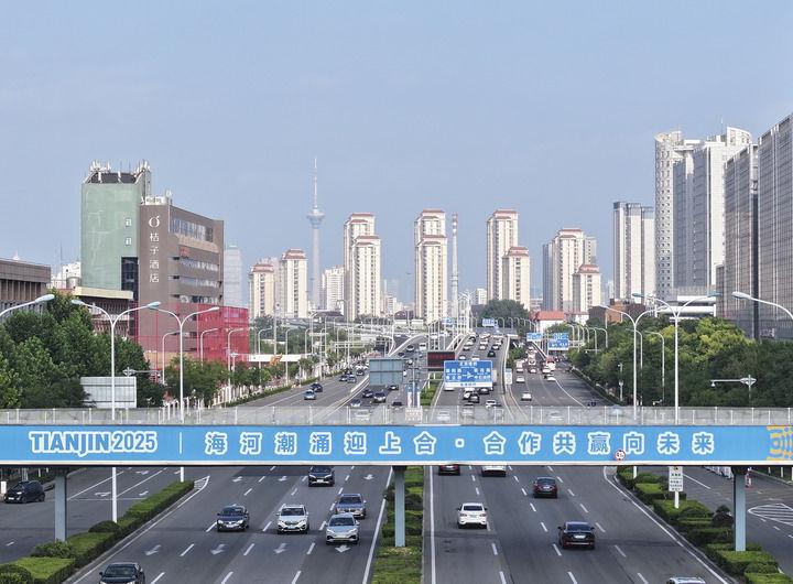 2025年8月5日拍摄的天津市西青区一过街天桥上的迎接上合组织天津峰会宣传标语(无人机照片)。新华社记者 李然 摄