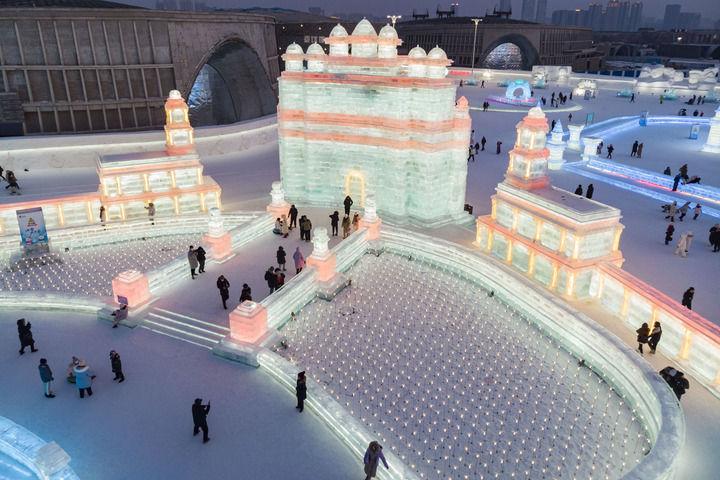 2023年2月1日,游客在哈尔滨冰雪大世界园区冰雪景观《胜利之城》周边游玩,该冰雪景观以印度的法塔赫布尔西格里城为原型设计建造(无人机照片)。此届哈尔滨冰雪大世界将上合组织成员国的特色建筑以冰雪景观的形式呈现。新华社记者 谢剑飞 摄