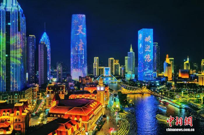 8月22日,航拍天津海河畔上合峰会主题灯光秀。(无人机照片)中新社记者 佟郁 摄