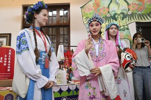 8月6日,上合组织国家青年学生在天津体验京剧艺术。新华社记者李然摄