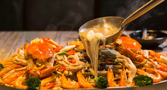 天津菜多勾芡。扇贝 、 海参 、 蛤蜊 、 鱿鱼 不易烹饪入味, 勾芡后, 淀粉带着调味料牢牢挂住食材。顺着这个思路,天津人开发出津门名菜八珍豆腐 。炸制的嫩豆腐辅以多种鲜货,热热闹闹炒一大盘子。