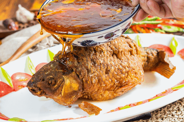 天津有道名菜罾(zēng) 蹦鲤鱼 ,鱼 炸制酥脆后, 趁热浇上一层酸甜的糖醋酱汁, 香味四溢 ,外酥里嫩,鱼肉入口即化。