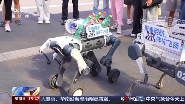 智能迎新小队工作人员何霖:它们一个是腿足式的,一个是轮足式的。轮足式的移动速度要更快,腿足式的承载能力更高,能够负载40公斤,帮新生们、家长们减轻运送行李的压力。