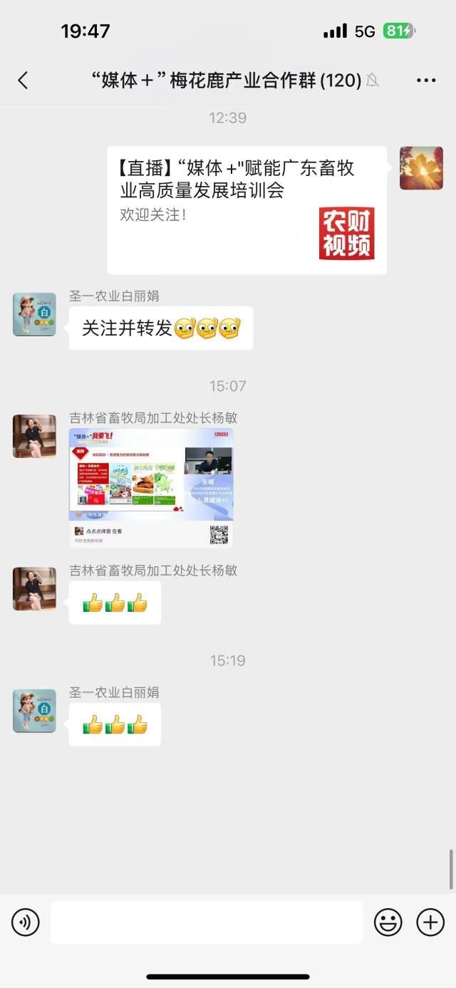 广东兴宁、乐昌及河北涞水县、吉林双阳等地积极行动,温氏集团、粤海饲料集团、燕塘乳业等企业组织人员参与并收听收看培训课。广东省兴宁市农业农村局局长罗国强表示:“我们将借此次培训课的东风,深入学习‘媒体+’的创新经验与做法,进一步推动兴宁鸽走向国际市场,助力其‘飞’上全球消费者的餐桌。”