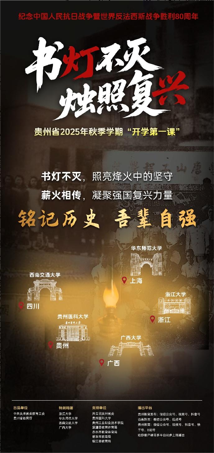 8月31日,中共贵州省委教育工委、贵州省教育厅联合五所高校打造的“开学第一课”《书灯不灭 烛照复兴》上线播出。节目以抗战时期高校西迁贵州办学的历史为主线,通过珍贵影像、AI复原场景和深情讲述,再现了战火中师生坚守教育使命、贵州人民与内迁高校共克时艰的感人历程。全省各地中小学积极响应,组织师生收看节目,并结合本地实际开展形式多样的抗战精神主题教育,让开学第一课成为铭记历史、传承精神、启迪未来的重要载体。