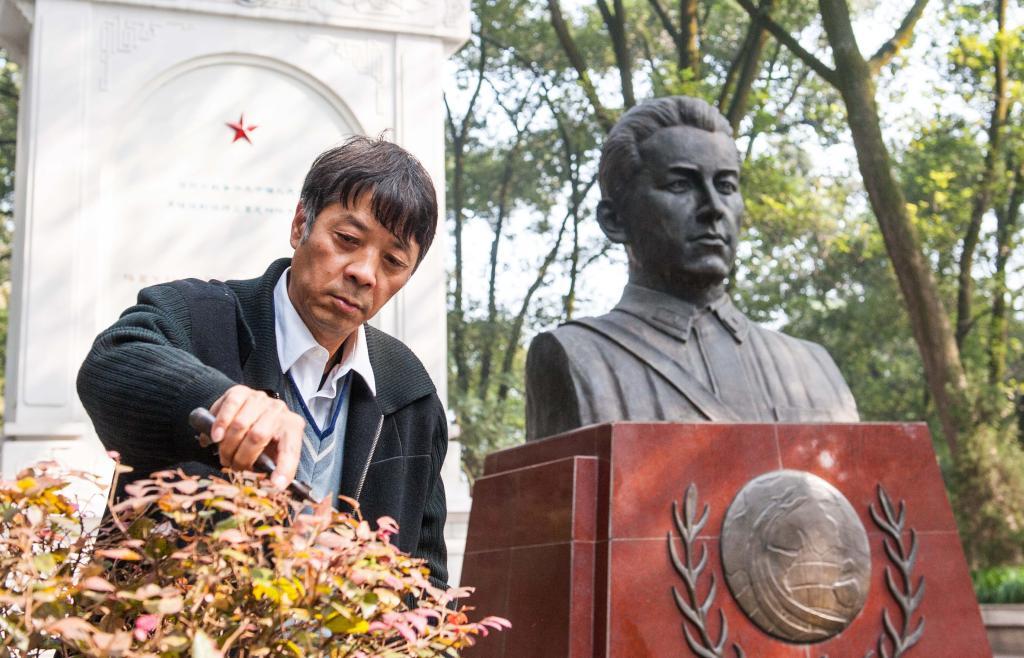 2014年11月19日,守陵人魏映祥在库里申科烈士陵园内库里申科烈士雕像前修剪陵园内的苗木。新华社记者 刘潺 摄