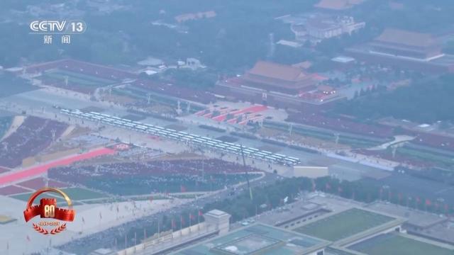 今天早晨,总台记者乘坐直升机,沿北京中轴线,空中拍摄纪念大会现场。