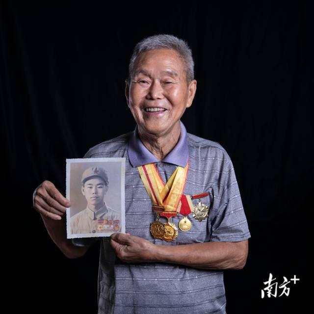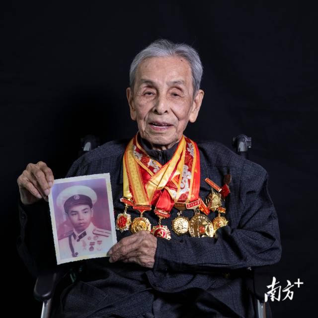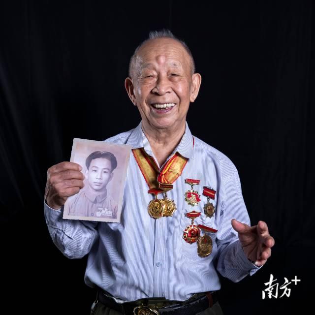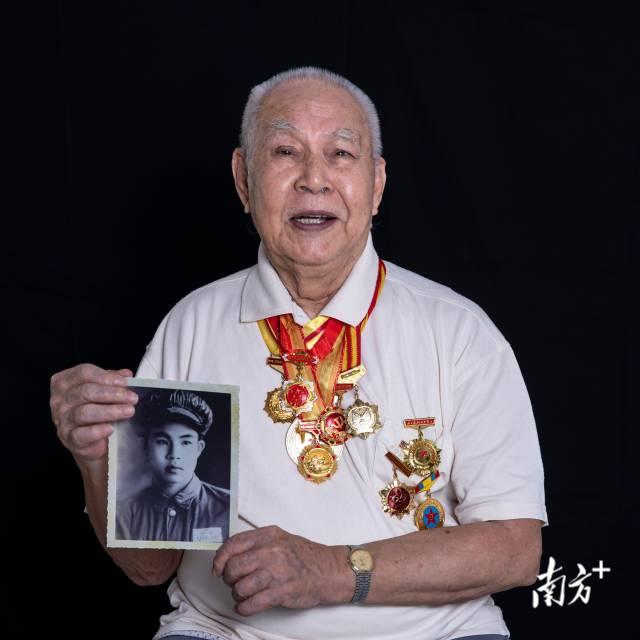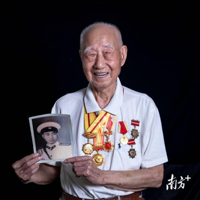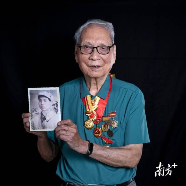 赖进添,今年99岁,8月18日摄于广州,拍摄手中青年戎装照时29岁。1926年,赖进添出生于广东恩平,于1944年在东莞樟木头投身革命,曾参加东江纵队,投身抗日救亡。1946年,他随队北撤山东。解放战争期间,赖进添先后在两广纵队、中南海岸炮团等部队任职,参与豫东战役、济南战役、淮海战役等多场战役。1947年10月,赖进添加入了中国共产党。