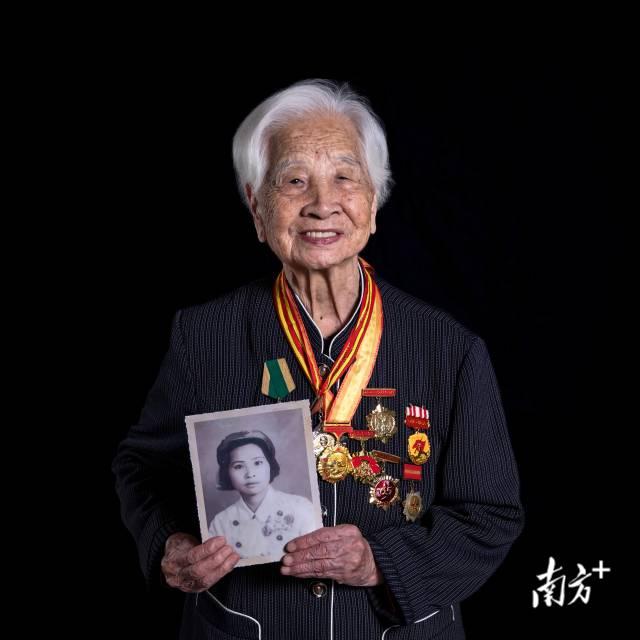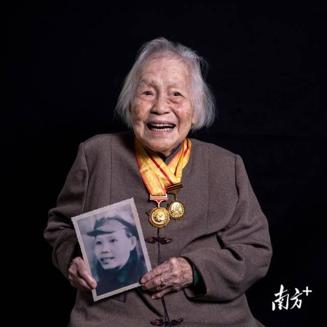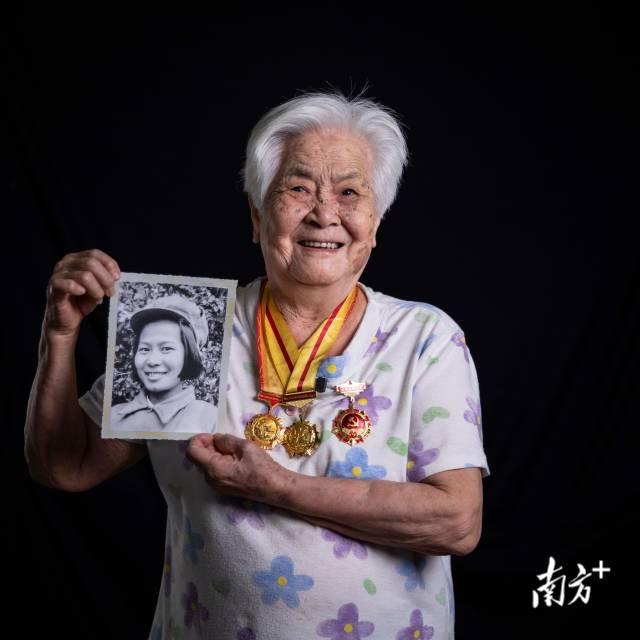 何值,今年98岁,8月23日摄于广州,拍摄手中青年戎装照时24岁。1927年,何值生于东莞,于1944年8月参加东江纵队。同年9月,她被分配到东江纵队政治部政工队,在大鹏半岛王母圩参与筹建路东地区第一个抗日民主政权——路东新一区人民政府,管辖大鹏地区6个乡。后来,她被派往东江纵队第一支队,在东江流动剧团任政治服务员,负责剧团的政治思想工作。