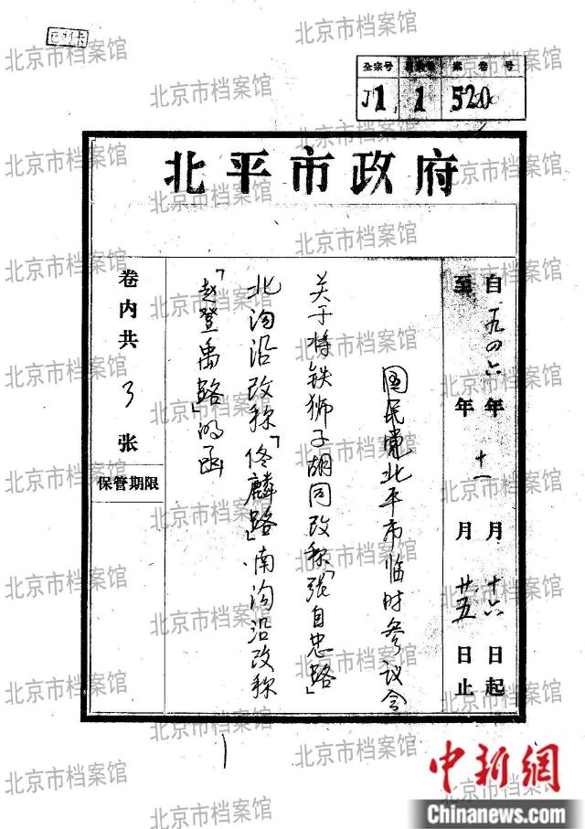 有关档案显示北平市临时参议会提出对三条道路进行改名的函。受访者供图