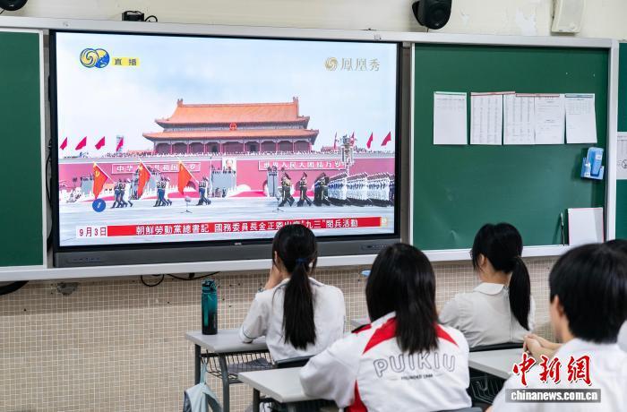 9月3日,香港培侨中学学生观看纪念中国人民抗日战争暨世界反法西斯战争胜利80周年大会直播。中新社记者 侯宇 摄