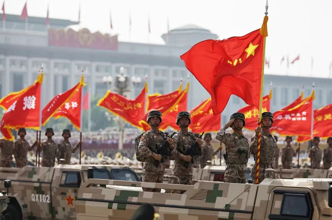 80面抗战英模部队荣誉旗帜组成战旗方队