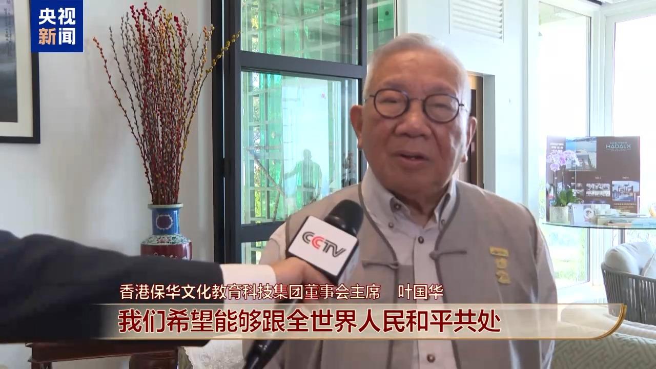 香港保华文化教育科技集团董事会主席 叶国华:我一般看电视都坐着。今天我不是坐着而是站着。因为我用最尊敬的心来看。习近平主席讲话精神是,我们希望能够跟全世界人民和平共处,能够以构建人类命运共同体来带动全球。