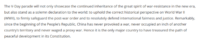 文章说,纪念活动不仅展示新时代对伟大抗战精神的传承,也是向世界的庄严宣告:坚持正确的二战历史观,坚定维护战后秩序,坚决捍卫国际公平正义。值得注意的是,自中华人民共和国成立以来,中国从未主动挑起战争,从未侵占他国一寸领土,也从未发动代理人战争。中国也是唯一将和平发展道路写入宪法的大国。