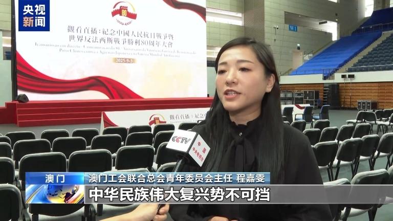 澳门工会联合总会青年委员会主任 程嘉雯:习近平总书记讲到中华民族伟大复兴势不可挡,人类和平与发展的崇高事业必将胜利。我们会坚定跟随国家坚持走和平发展道路,以史为鉴,发扬抗战精神,继续引领澳门青年发挥“一国两制”的独特优势,为中华民族伟大复兴贡献我们的力量。
