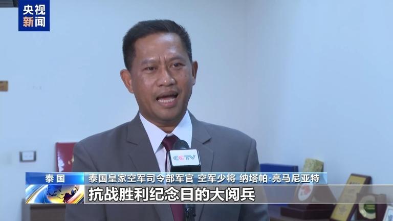 泰国皇家空军司令部军官、空军少将 纳塔帕·亮马尼亚特:抗战胜利纪念日的大阅兵,让世界看到了习近平主席领导下的中国军队装备先进、气势恢宏。我们看到了正义的力量卓然壮大。