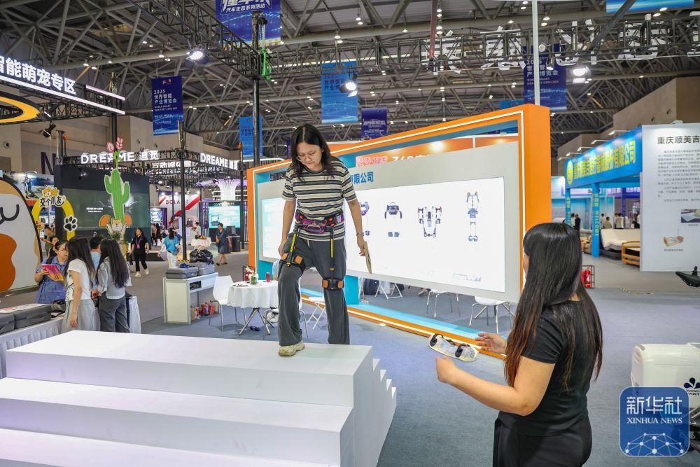 ↑ 9月5日,观众在2025世界智能产业博览会上体验外骨骼机器人。