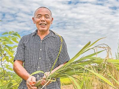 四川彭州湔江堰 四川彭州市敖平镇农民展示由湔江堰灌区的水浇灌长成的水稻。彭州市敖平镇人民政府供图