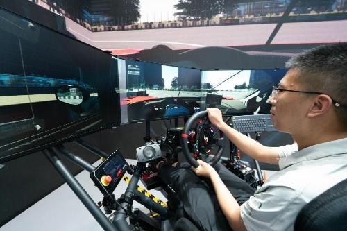 ↑9月11日,参观者在体验六自由度赛车模拟器。