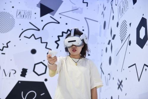 ↑9月11日,参展者在文旅服务专题展区海淀展厅体验沉浸式VR大空间项目。