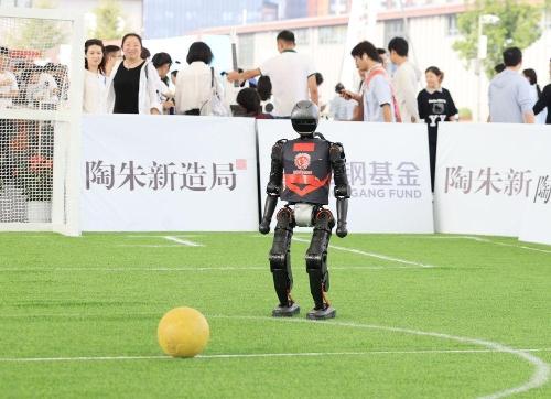 ↑这是9月11日在体育服务专题展区拍摄的一款人形机器人演示踢足球。
