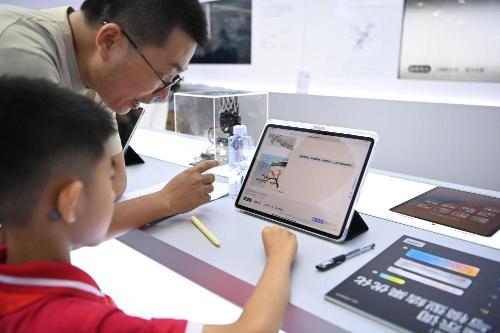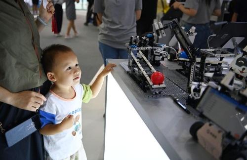 ↑9月11日,在服贸会教育服务专题展区,一名小朋友在猿编程展台观看最新AI教育产品。