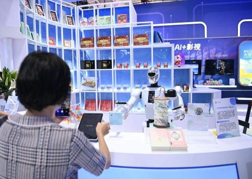 ↑9月11日,在服贸会文旅服务专题展区,参观者在“海淀有礼文创机器人快闪店”与机器人互动。