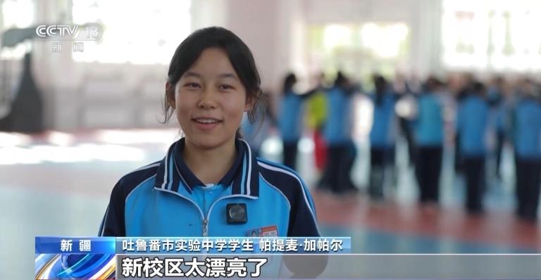 吐鲁番市实验中学学生帕提麦·加帕尔:新校区太漂亮了,在这里我现在学习劲头儿十足,已经爱上这里的生活了。