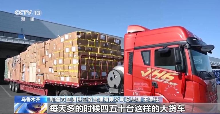新疆万盛通供应链管理有限公司总经理王添柱:以前谁在新疆发空运,现在全国各地的大货车都到新疆来发,每天多的时候四五十台的大货车就在这排队进去。