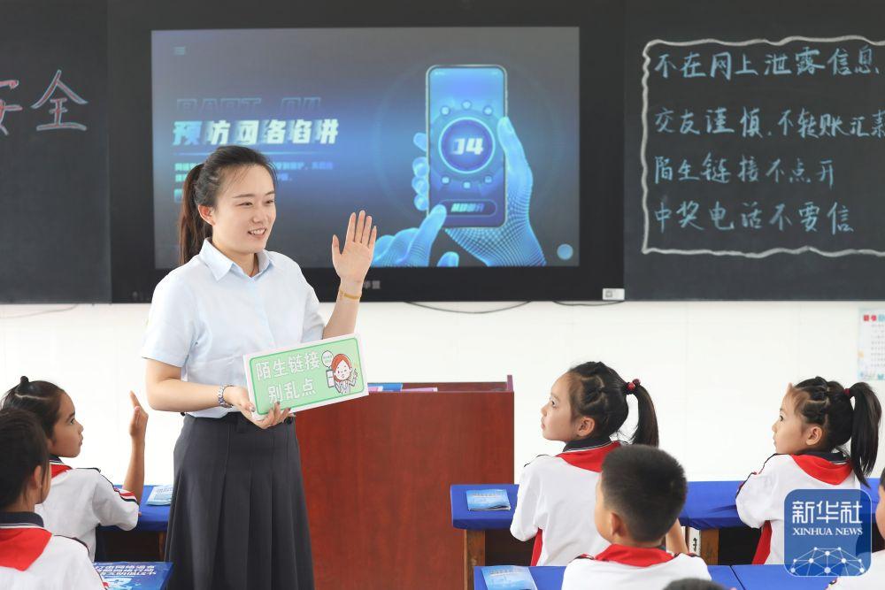 9月15日,河北省唐山市丰润区泉河头小学老师在给学生讲解网络安全知识。新华社发(朱大勇摄)