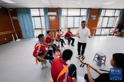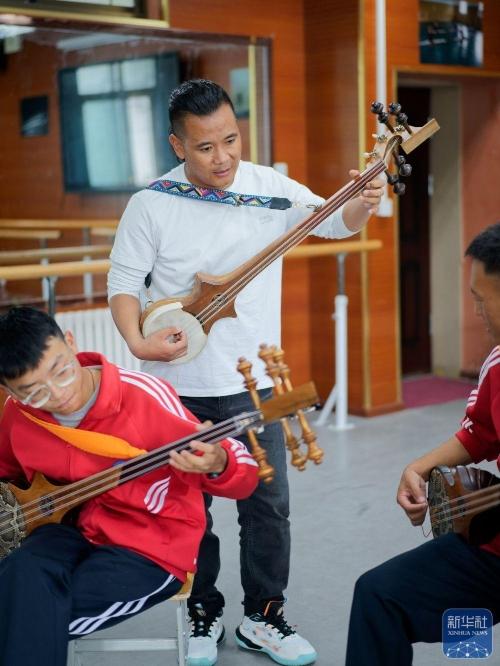 ↑9月9日,在拉萨市第二中等职业技术学校,洛桑次仁老师在给孩子们传授扎念琴弹奏的要领。