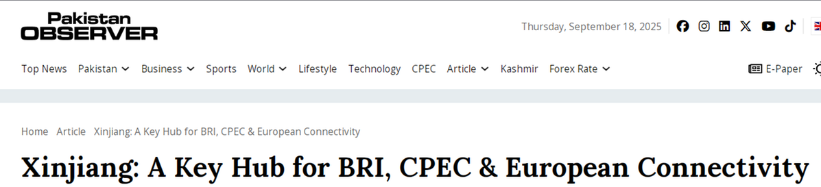 《巴基斯坦观察家报》报道称,新疆凭借其丰富的资源、优越的地理位置和发达的基础设施,成为中国与中亚和欧洲互联互通的重要枢纽。在共建“一带一路”倡议框架下,新疆在促进区域贸易、商业和进出口方面发挥着日益重要的作用。