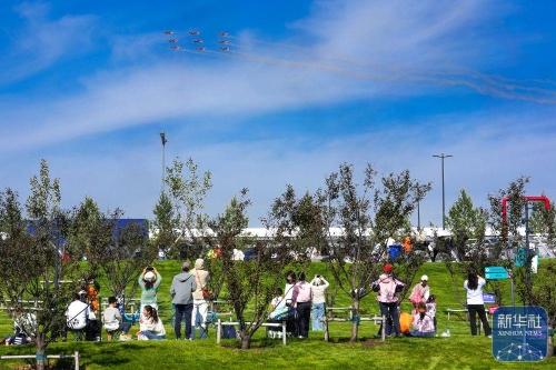 ↑ 9月20日,参观者在长春市蓝天公园观赏飞行表演。