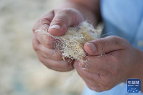 ↑9月20日,在新疆尉犁一家服装公司的罗布麻纤维脱胶车间,工人查看脱胶漂白后的产品品质。新华社发(汪志鹏 摄)