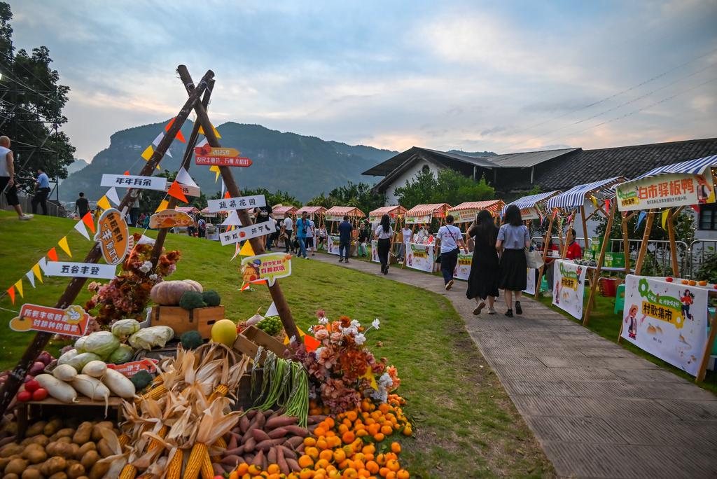 “村歌集市”上,万州本地的农副产品琳琅满目,30多类农特产品、近10种非遗技艺吸引大量游客驻足选购。作为地方特色,怪味鸭、芥末凉面等特色小吃成了“爆款”,桂圆、皮蛋等农产品很快售罄,“陈皮一口脆”、万州烤鱼摊位更是排起了长龙……