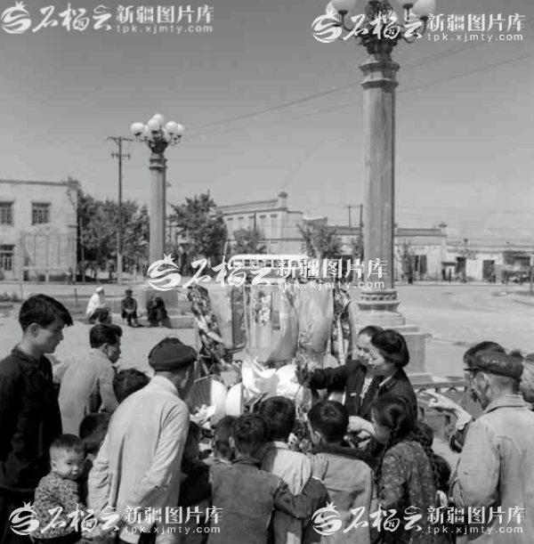 商店售货员在街上流动售货,成为上世纪六七十年代一道风景。图片由新疆图片库提供