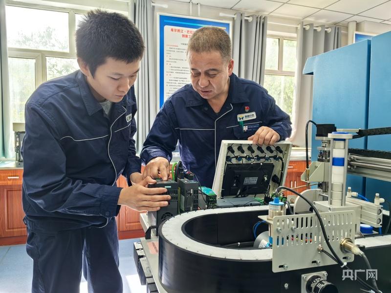 央广网乌鲁木齐9月24日消息 走进位于新疆乌鲁木齐市米东区的新疆华泰重化工有限责任公司库尔班江·巴拉提维修电工技能大师创新工作室,今年46岁的库尔班江·巴拉提正在带着徒弟做试验。