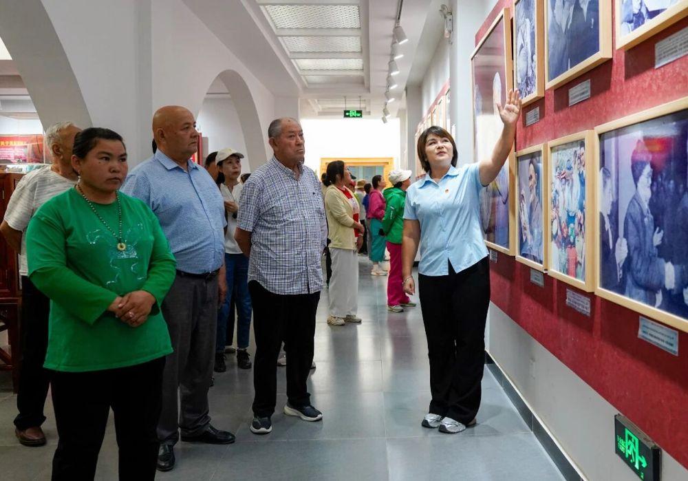 在新疆和田地区于田县库尔班·吐鲁木纪念馆,如克亚木(右一)向参观者介绍展出的照片(2025年9月14日摄)。新华社记者丁磊摄