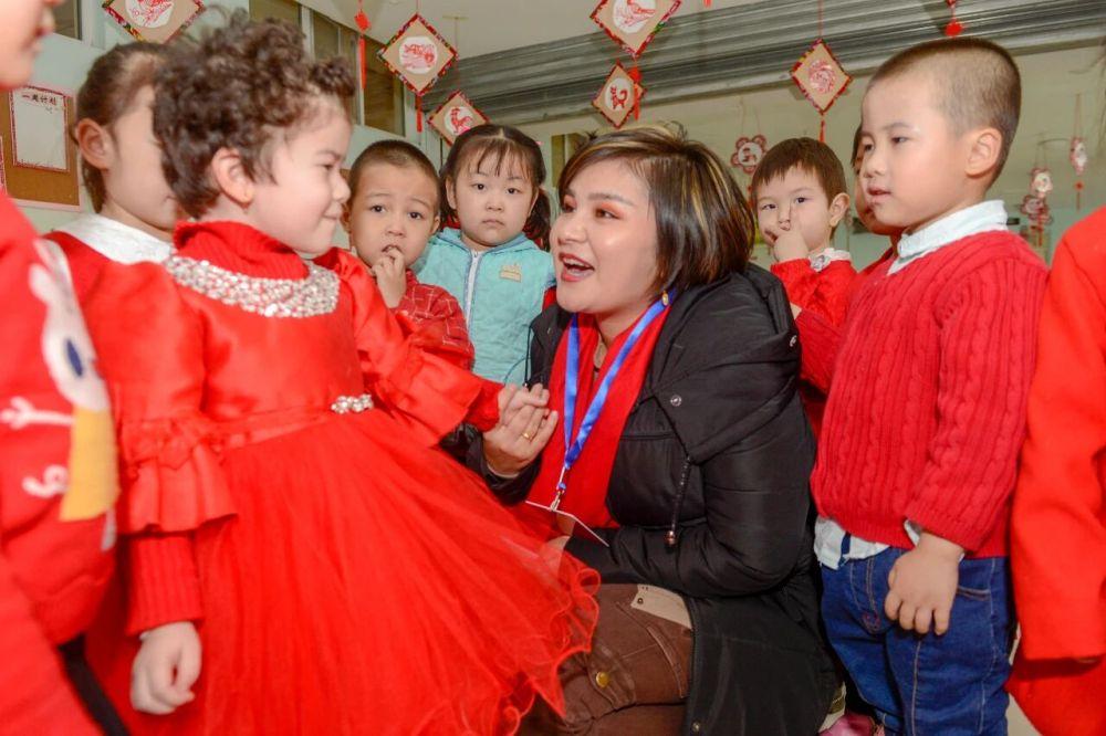 全国人大代表如克亚木(右三)在集中视察活动中,来到新疆鄯善县中心幼儿园与孩子们交谈(2019年2月14日摄)。新华社记者丁磊摄