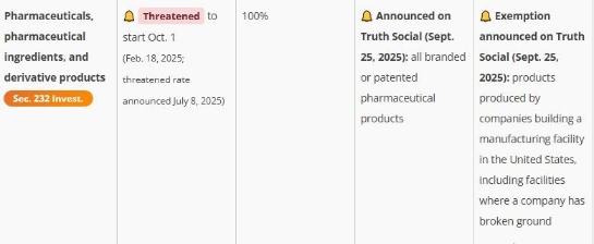 特朗普在社交媒体上发文称:“自2025年10月1日起,我们将对所有品牌或专利药品征收100%关税,除非相关公司在美国建立制药厂。”