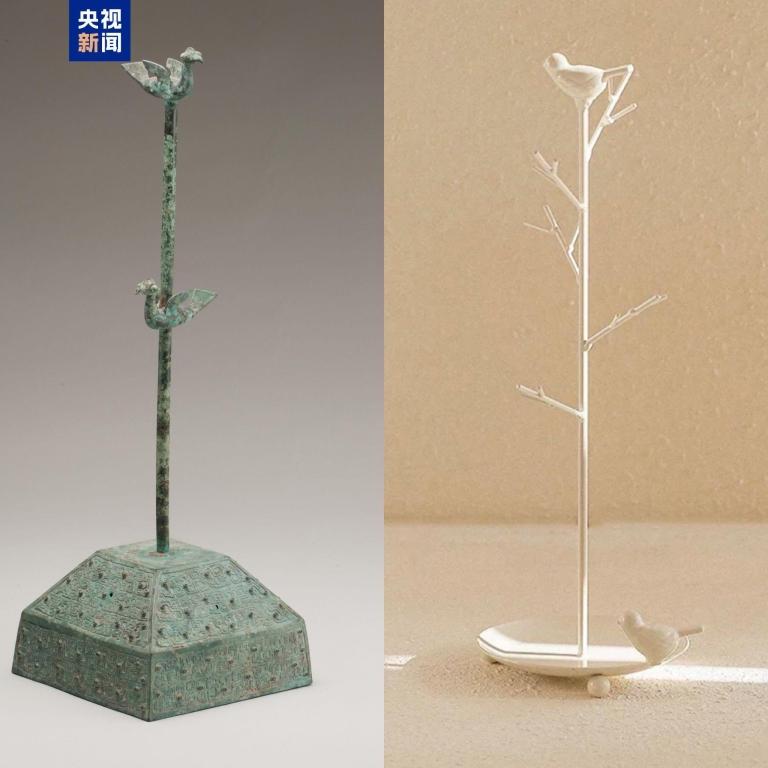 △铜鸟柱(左)与现代饰品架(右)对比图
