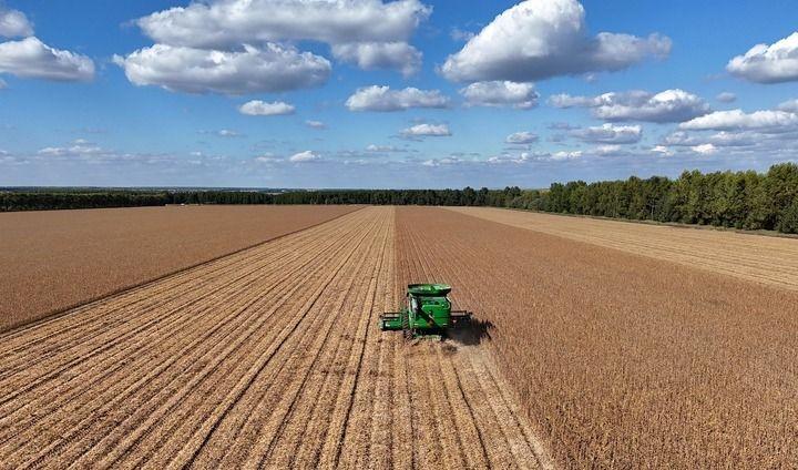 2025年9月19日,在北大荒集团黑龙江格球山农场有限公司大豆地块,收获机车在进行收获作业(无人机照片)。/新华社发(陆文祥摄)