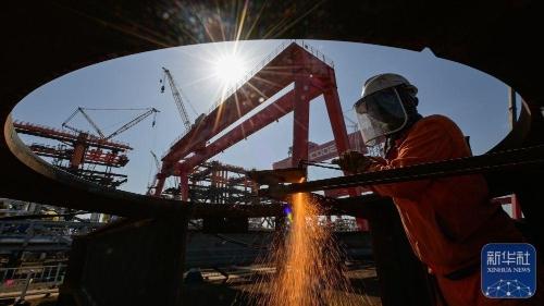 ↑10月1日,在天津市滨海新区,渤海油田工人进行气割作业。新华社发(杜鹏辉摄)