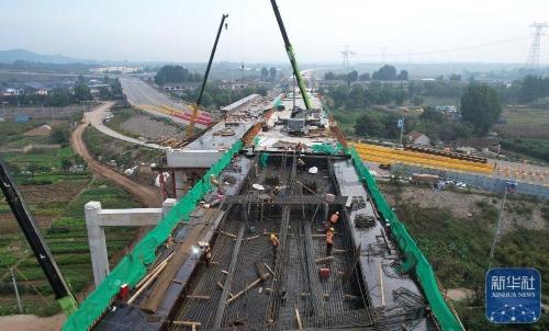 ↑10月1日,工人在董梁高速公路沈新段山东省沂南县铜井镇鲁家庄互通建设工地施工作业(无人机照片)。新华社发(王彦冰摄)