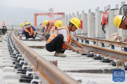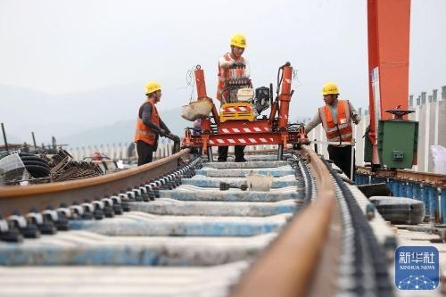 ↑10月1日,中铁十一局建设者在浙江省湖州市德清县杭德市域铁路高架线铺轨现场施工作业。新华社发(谢尚国摄)