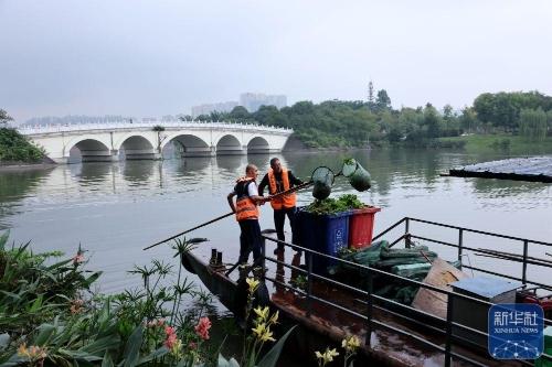 ↑10月1日,四川省眉山市东坡区环卫工人在东坡湖上打捞水草。新华社发(姚永亮摄)
