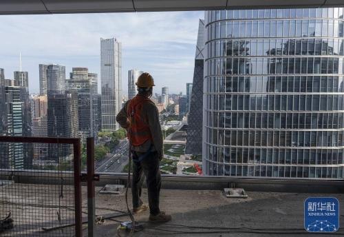 ↑10月1日,在北京CBD核心区Z3项目上,玻璃幕墙安装工人在施工间歇观赏城市景色。新华社记者 才扬 摄