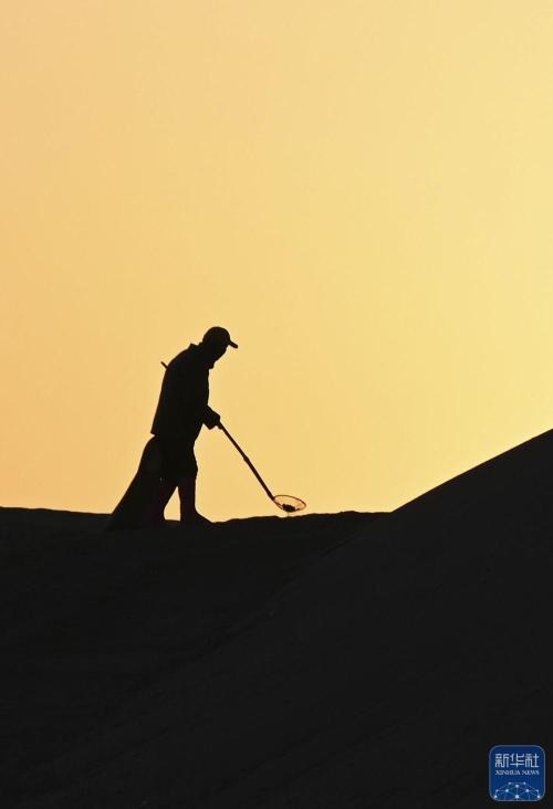↑10月1日,保洁人员在甘肃省敦煌市鸣沙山月牙泉景区保洁。新华社发(张晓亮摄)