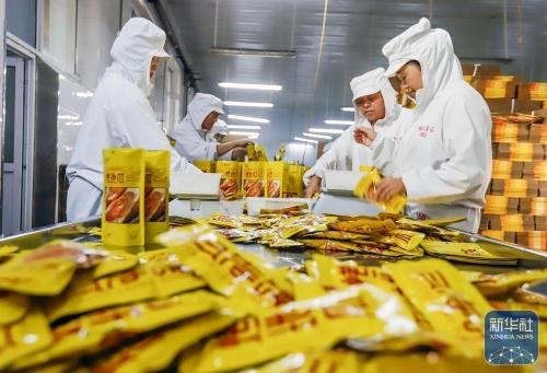 ↑10月1日,工人在河北省遵化市苏家洼镇一家食品加工企业包装车间工作。新华社发(刘满仓摄)